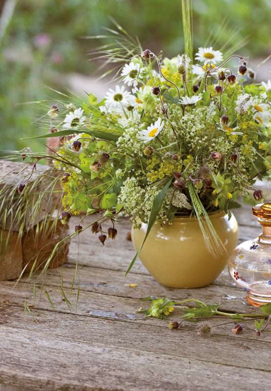 Üppige und fantasievolle Blumensträuße auf dem Tisch, und das zu jeder Jahreszeit – dafür braucht man keinen dicken Geldbeutel und auch keinen Luxusgarten. Die Natur schenkt uns alles, was wir dazu brauchen, schon auf einem kleinen Spaziergang durch die nächste Umgebung, mit offenen Augen für die Blumen am Wegrand und auf der Wiese: Mal stehen ein paar Blumen vom Bauernmarkt wie Löwenmäulchen oder Gladiolen im Mittelpunkt, mit denen scheinbares Unkraut einen wundervollen Strauß bildet, mal sind es unreife Brombeeren, getrocknete Disteln, Getreideähren oder die dekorativen Fruchtstände der Waldrebe, die einem Strauß oder Kranz das gewisse Etwas geben.