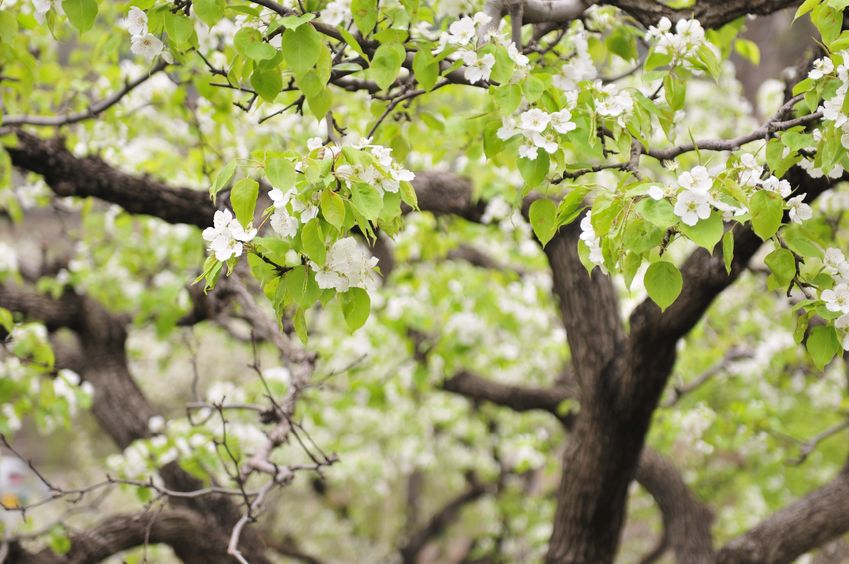 Pears bloom in April; five bright white petals make the hermaphrodite pear blossom a true eye-catcher. Since it is self-sterile, it requires a suitable pollen source nearby. Hidden within the fruit flesh are woody cells called stone cells.